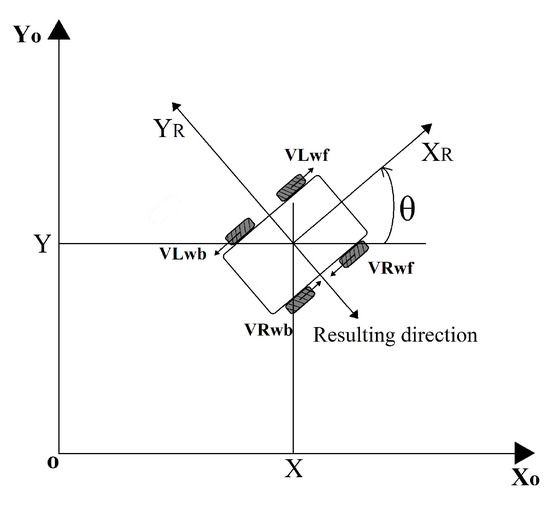 The motion and the steering of an omnidirectional mobile platform is related to the speed and sense of rotation of its actuated wheels [34]. In a four wheel configuration, an example of a lateral motion in the direction of axis can be obtained by rotating facing wheels in opposite directions, as shown in Figure 7.
