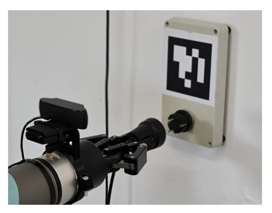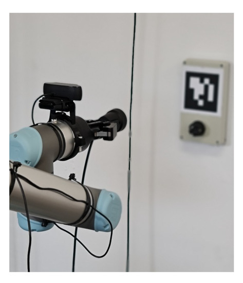 Initially, the ACS robot arm is facing the wall plug (Figure 12a). When a charge request received? condition is true (the AEV sends a charge request to the ACS through a websocket), the charging process begins. The first sequence, as explained in the decision-tree scheme (Figure 5), is to align the MP to the wall-plug (Figure 12b).