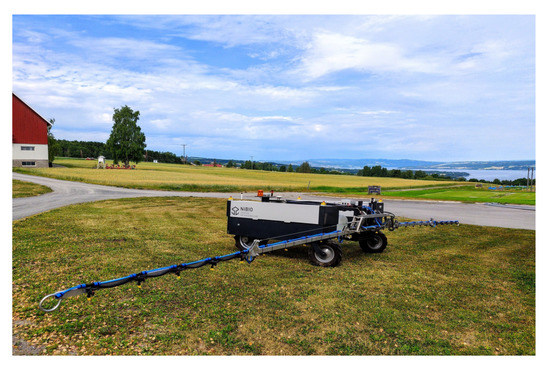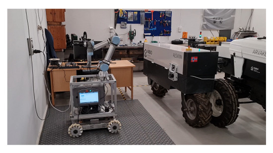The developed platform was tested under a real-world scenario. The experimental setup consisted of a garage where we parked our electrical vehicle at the Apelsvoll research station (northern Oslo, Norway). The garage has a flat surface that allows the omnidirectional ACS to move freely on its 2D plane. The AEV used for the test is a differential drive electrical tractor robot prototype produced by the Danish company AgroIntelli (Figure 11).