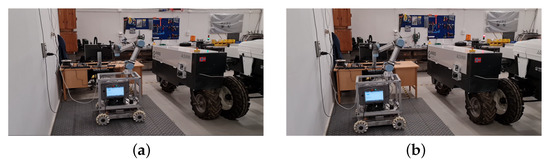On the AEV side, we use the included AC–DC charging transformer that comes with the vehicle. The Schuko plug of the transformer is hosted in a box mounted on the vehicle. Similarly to the wall-plug, a fiducial marker with a different identifier is used as reference for the vision-based navigation and plug/unplug processes of the ACS. As the AEV is working in the fields, and to protect the marker from dust/mud, which make its detection not possible, we installed the marker on the inner-side of the box lid; this means that when the AEV is driving in the field, the box is closed, and thus the marker protected. When the AEV enters the garage, and requests to charge its batteries, the lid opens, and the marker becomes visible (Figure 4b). The idea is to install a servo-motor and fit it with the lid, but this is considered as a next step as the focus on this work is on the ACS and its core functionalities.