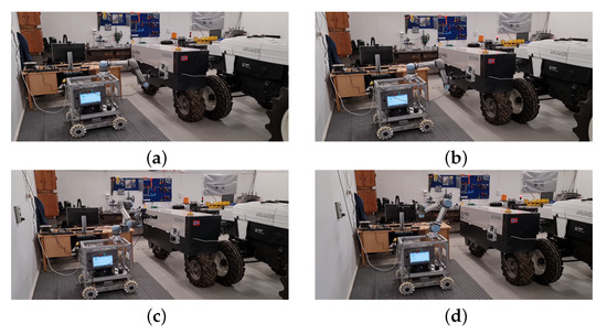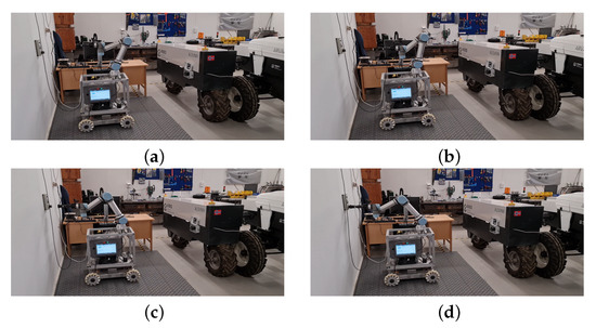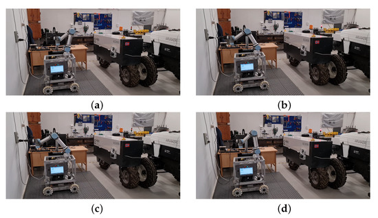 The final sequence starts when the ACS receives a websocket message from the AEV requesting the ACS to remove the charging cable. In the case that the ACS received other charging requests, and the AEV is finished charging and asking for the charging cable to be removed, the first step for the ACS is to align to the AEV, center the gripper to the AEV reference (the fiducial marker), then proceed with removing the cable. In the case of the presented experiment, and for the sake of simplicity, there was no charging requests from other AEVs; therefore, the ACS was on standby mode while the latter was charging. Thus, the first step is to proceed again to the approach position with the gripper being open (Figure 15a). The gripper then closes and unplug the cable (Figure 15b), then the robot arm turns towards the wall-plug to initiate the next sequence to plug the cable back to the wall-plug (Figure 15c,d).