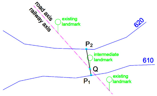 From the topographic map, the point Q is known and two segments A11A12 and A21A22 are determined belonging to the level curves from Figure 1 (A11A12 on curve 610 and A21A22 on curve 620). These two segments are found according to Figure 3. The method consists of drawing the perpendiculars from the given point Q on the two given lines d1 and, respectively, d2 (Figure 5). We construct a line passing through Q which is parallel to the line determined by the feet of the two perpendiculars. The obtained line is denoted by d3, and its intersection with the lines d1 and d2 is the searched segment [P1P2] (approximate solution of SSTPC2L).