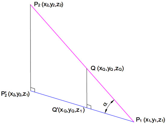 The problem of estimating the slope between two points is significant, seeing that when designing roads, the slope between any two points on a road cannot exceed a given maximum slope, e.g., for highways this value has to be less than 6% or 7%. Therefore, the chosen points from the future road can be tested for this eligibility. To do that, we consider the elevations of the points Q1 and Q2 calculated using formula (26) and we can estimate the slope m(Q1,Q2) of the road passing through Q1(x1,y1,z1) and Q2(x2,y2,z2) using the following formula (see Figure 7):