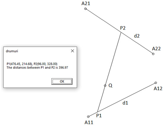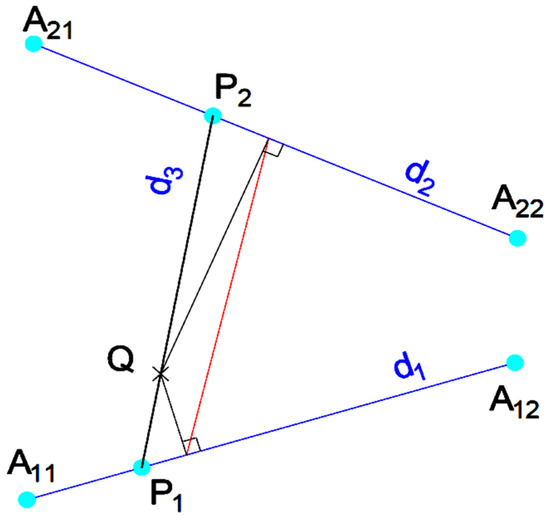 After applying AIPS, the problem is reduced to calculating the shortest segment that passes through a given point Q and connects two coplanar lines d1 and d2 (Figure 4). We shall denote this problem as SSTPC2L (shortest segment through a point that connects 2 lines). In Figure 4 the points A11 and A12 determine the line d1, and the points A21 and A22 determine the line d2.