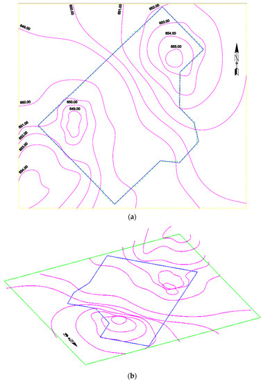 Using the coordinates of the points Qk (k = 1, 2, …, 6) from Table 1, Bresenham, and, then flood fill algorithms were applied resulting in 803 points located inside the perimeter of the house. The elevations of these points were calculated using A2SSTPC2L and (26). The algorithm AHEFP was applied for these 803 elevations and the height of the horizontal excavation/filling plane was accurately estimated as 706.2571 m, instead of the value 707 m proposed by the designer. Out of the 803 points, 412 were located below the horizontal plane, and 391 had the elevation over this plane.