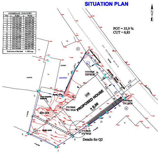 Figure 10 shows a real topographic map for a plot of land on which a house is to be built. The topographic map of the land was drawn up by a topometric engineer, with specific high-precision equipment, called in specialized terms “station.” For small areas of land, the station is successively placed and GPS 3D coordinates are measured relative to a fixed position (in our situation it is a terminal in the Black Sea area located at a distance of approximately 717 km). The first chosen points of the topographic survey are those that describe the contour of the plot of land. In our case, the terrain contour is described by the 15 points (numbered in black). These points are inventoried and noted in a table (coordinate inventory) located on the topographic map. The following points will describe the contour of the level elevations, the positioning of the access road, the position of the neighboring houses (they are marked on the map in red together with the elevation), etc. In the case of lands with a high slope, such as the one exemplified, the measured points must be thickened for a greater accuracy of tracing the level curves (in total we have over 100 such points).