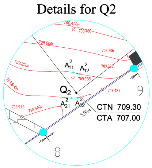 Table 2 presents the coordinates of the points calculated for each point Qk (k = 1, 2, …, 6) by applying AIPS. Using A2SSTPC2L and (26), the elevation for each point Qk (k = 1, 2, …, 6) is calculated.