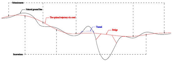 The optimal trajectory of a road depending on the elevation of the natural land.
