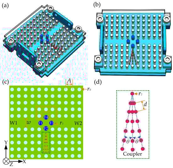 The third arm of the PCW is closed, in which a fan-shaped PC array structure is introduced, which is also formed by Al2O3 ceramic rods with radius r2. The area of the fan-shaped PCs is determined by the angle θ and the distance d of the two rods, as shown in Figure 1d. The fan-shaped coupler is exactly located in the middle of the lower arm of the T-shaped PCW. The total length of the fan-shaped coupler is 6 mm with d = 0.5A, where A is assumed 4 mm long. At the center of the PCW, four ferrite posts (blue) with the radius r1 and relative dielectric constant 13.5 are introduced, which are marked F1, F2, F3 and F4.