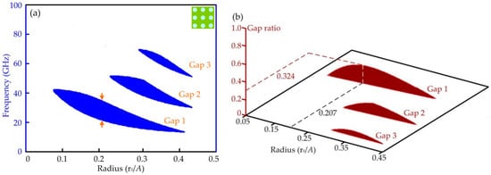 (a) The TE band gaps of the SLPCs with the Al2O3 rods’ radius; (b) the gaps’ ratios with the radius of the Al2O3 rods.
