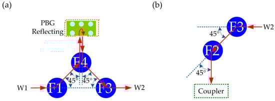 In Figure 3, the operating principle of the designed PC isolator is introduced by describing two transmission paths. The electromagnetic wave incoming from W1 takes place a 90° rotation by the cooperation of the ferrite posts F1 and F4 and is totally reflected by the cavity. The reflecting cavity consists of the ferrite post F4 and the five Al2O3 rods in the orange dotted box as shown in Figure 1c. Then, the electromagnetic wave rotates with an angle of 90° again when it transmits through the ferrite posts F4 and F3 sequentially. Finally, the signal exactly travels to W2 as shown in Figure 3a. It can be seen that the electromagnetic wave transmission along a straight line is realized by bending twice of 90° with the three ferrite posts and the aid of the reflecting cavity.
