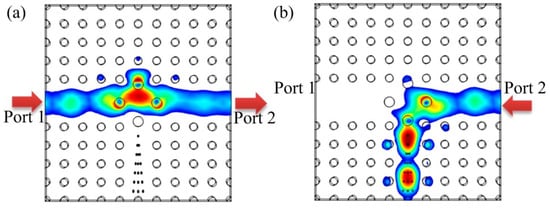 where ε is the relative dielectric constant of the materials, ω is the frequency of incident signal, c is the speed of the light and is the electric field intensity. The parameters of the designed PCs isolator are , , , , , , w and h . At 26 GHz, the power distribution of the signal in the PCs isolator is shown in Figure 4.