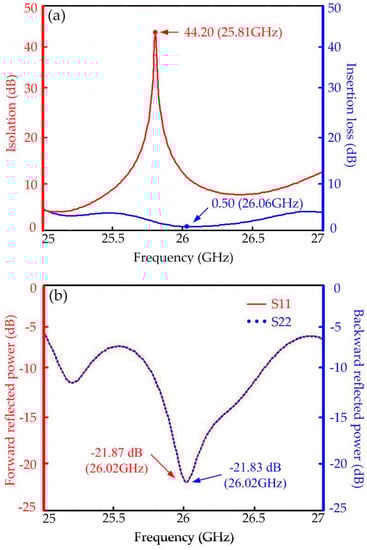 In Figure 5a, the numerical results suggest that the optimal isolation of the PCs isolator is 44.20 dB at 25.81 GHz, and the isolation remains above 15 dB within the range of 25.66 to 25.95 GHz. In addition, the insertion loss is low to 0.50 dB at 26.06 GHz with the transmission efficiency of above 50% (3 dB) over a wide frequency range from 25.03 to 26.92 GHz, revealing an excellent forward transmission characteristic of the proposed PCs isolator. The curves of the forward and backward reflected powers of the PCs isolator with frequency are basically coincident, as shown in Figure 5b. It means that the return losses of the two ports are almost the same, which are reflected by the symmetrical structure. The peaks of the S parameters S11 and S22 respectively are −21.87 dB and −21.83 dB at 26.02 GHz. The S parameters play important roles in describing the performance of the devices, which are the ratios between the powers of waves between these ports. In our design, the parameters S11 and S22 represent the ratio of the reflected power to the input power of the Port 1 and Port 2, respectively. The parameter S21 represents the insertion loss of the isolator, which is the logarithmic value of the ratio of the transmission power of the Port 2 from the input power of the Port 1. Moreover, the parameter S12 is used to measure the isolation performance of the isolator, which is described in detail in [].