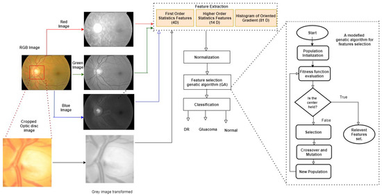 This article tackles the above challenges, culminating in an accurate retinal diagnostic and prognostic system that discriminates among DR, glaucoma, and normal (free of diseases) cases using a retinal fundus image. To this end, the RGB image is first transformed into its elementary components: red (R), green (G), and blue (B) channels. Then, three groups of distinct features are composed for the image. The first-order statistics (FOS) group contains 4 features per channel, giving rise to 12 features for the 3 channels. The higher-order statistics (HOS) group contains 14 features per channel per displacement, giving rise to 112 features for the 3 channels and 8 displacements. The histogram of oriented gradient (HOG) group contains 81 features. The three groups thus collectively contain 429 features that can discern between the three classes we consider. However, to make the processing more efficient, a genetic algorithm (GA)-based scheme is leveraged to select the most relevant and informative of these features, successfully reducing them to 105.