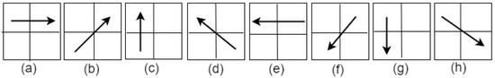 The eight displacement vectors that describe all possible directions of adjacency pixels. They are used to calculate the HOS features. (a) ; (b) ; (c) ; (d) ; (e) ; (f) ; (g) ; (h) .