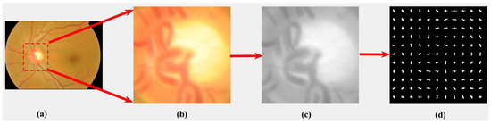In the beginning, the RGB image is processed in two steps. The first step is to transform the RGB image into its essential R, G, and B channels. The second step is to identify and crop the OD region using the given center pixel location and the OD’s diameter. The cropped OD region is converted into gray-scale.