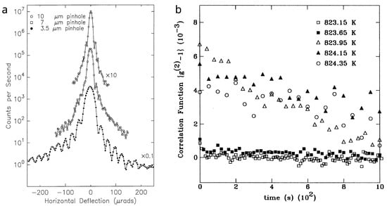 (a) Airy fringes from Fraunhofer diffraction from slits of different sizes as indicated. Data has been measured in the commissioning of the ID10 beamtime at ESRF, the first dedicated beamline for coherence applications []. Figure reproduced from []. Copyright 1997 Society of Photo-Optical Instrumentation Engineers (SPIE). (b)  functions from FeAl at the  superlattice reflection measured at ID10 [] showing fluctuations above the order-disorder transition temperature of  K.