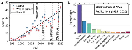 (a) Publications mentioning X-ray photon correlation spectroscopy (XPCS), X-ray speckle visibility spectroscopy (XSVS) or X-ray intensity fluctuation spectroscopy (XIFS) as keyword, in the title or abstract. The solid line models a linear increase of the SCOPUS data between 1998 and 2020 with an increase rate of 1.62 publications per year. The dashed lines mark the years where new beamlines with XPCS dedication became online. (b) Distribution of subject areas of XPCS publications from 1995 to 2020. For each publication multiple areas are possible.