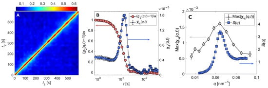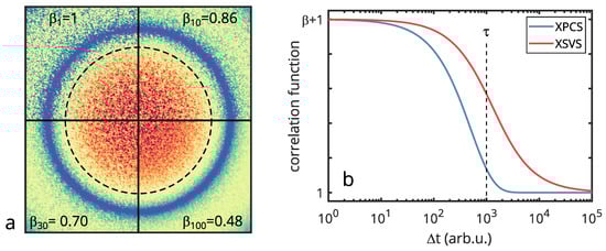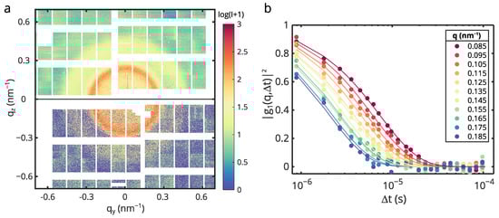 that compares the intensities  and  at two different times with a lag time of . Here, q is the modulus of the wave vector transfer given by , with wavelength  and scattering angle . The averaging in Equation (1) is performed over both detector pixels with equivalent q-values and all times t. Therefore, the -function provides information on the average dynamics during the exposure. Strategies for measuring dynamic heterogeneities without averaging over t are presented in the next section.