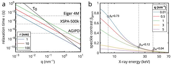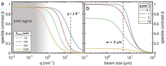 with the sample-detector distance  and the beam size w. With increasing scattering angle, the longitudinal coherence length affects the speckle contrast resulting in effective reduction. The contrast can be calculated by considering the actual beam shape and coherence lengths, details can be found in []. Here we want to discuss several consequences for measuring speckle contrast and thus performing XPCS and XSVS experiments. Besides the bandwidth, coherence length and beam sizes, the sample dimensions and detector pixel sizes define the measured speckle contrast. Examples for such geometrical speckle contrasts are given in Figure 6. Note that this has to be multiplied by the actual degree of transverse coherence to obtain the experimental speckle contrast. For a SAXS geometry, the contrast is maximized, and drops towards the WAXS regime. This further demonstrates, that XPCS or XSVS in SAXS geometry can be typically performed with beam sizes in the range of 10 m and sample thicknesses in the mm range. In contrast, WAXS geometries that allow probing molecular length scales, demand smaller beam sizes and in particular thinner samples or a smaller bandwidth. As both reduces the scattering intensity, XPCS in WAXS geometry typically results in lower count rates.