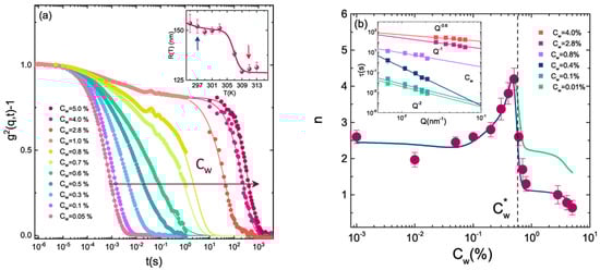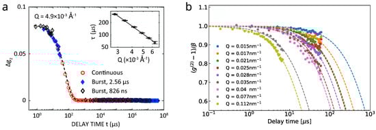 with the static structure factor . The function  describes the hydrodynamic interactions, including electrostatic repulsion between particles and solvent fluctuations due to particle movement [,,,]. Furthermore, multiple dynamical processes can be measured as well as a superposition of different decay of . Exemplary -functions are shown in Figure 3b,c.