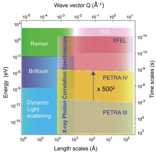 where  denotes the incident coherent flux,  is the number of detector pixels, T the total acquisition time and  the shortest accessible time, e.g., defined by the repetition rate of the detector. As a result, an increase of a factor x of intensity will result in a reduction the accessible time scale  of  at the same . This demonstrates that XPCS benefits strongly from an increased brilliance at new X-ray sources and high-speed detectors.