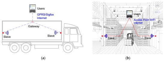 (a) Two slave nodes are communicating with one gateway node, which provides the cloud access; (b) two slave nodes are sending the measured information to the cloud servers through an existing Wi-Fi infrastructure.