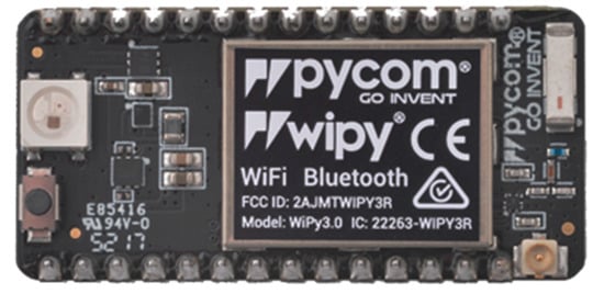 The sensor nodes were developed under hardware platforms based on ESP32 (ESPRESSIF SYSTEMS, Co., Ltd., Shanghai, China) that provide embedded Wi-Fi and BLE interfaces besides several input/output pins for reading and control of the sensors. ESP32 is capable of functioning reliably in industrial environments, with an operating temperature ranging from –40 °C to +125 °C. It is engineered for mobile devices, wearable electronics and IoT applications, ESP32 achieves ultra-low power consumption with a combination of several types of proprietary software. ESP32 also includes state-of-the-art features, such as fine-grained clock gating, various power modes and dynamic power scaling. It includes built-in antenna switches, RF balun, power amplifier, low-noise receiver amplifier, filters and power management modules []. WiPy (Pycom Ltd., Eindhoven, The Netherlands) is a microPython-enabled ESP32-based development board with a full suite of free services []. WiPy 3.0 is an updated enterprise grade IoT development platform. The tiny MicroPython enables Wi-Fi and a Bluetooth IoT development platform with a ESP32 chipset and dual processor [] (see Figure 2). Pycom provides software libraries to control the device and the interfaces that can be used.