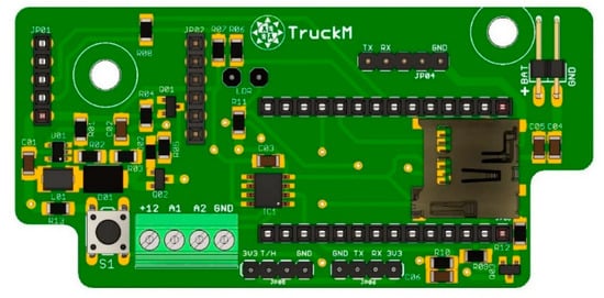 A synergy between the connection by BLE or LoRa and the communication using GSM is made by Roambee (Roambee Corporation, Santa Clara, CA, USA) [], Swiftsensor (Swift Sensors, Inc., Austin, TX, USA) [] or JRI (JRI, Fesches le Châtel, France) [], whose systems send the registered data to a user interface. Laird Connectivity (Laird Connectivity, Akron, OH, USA) [] has replaced BLE with NB and LTE. Meanwhile, HyperTech (Hyper-Tech Systems, Petach Tikva, Israel) [] offers sensors based on Zigbee wireless devices, in the same way as hIOTron (hIOTron Gateway and application, Ashoka Nagar, Maharashtra) [], which includes with in-built GNSS module to track the vehicle position. Other companies including SenseAware from FedEx (FedEx Corporate Services, Inc., Memphis, TN, USA) [] or TagBox (TagBox Solutions Private Limited, Bengaluru, India) [] prefer to work with wireless devices that use Wi-Fi and GSM technologies for communication facilities.