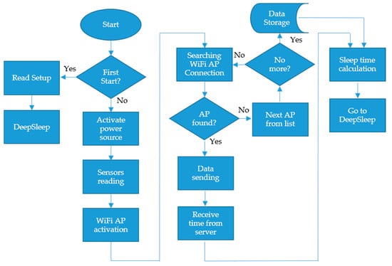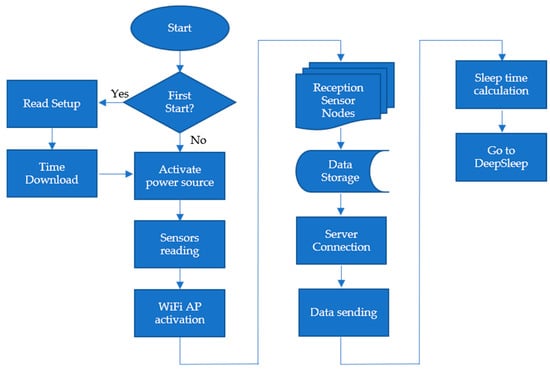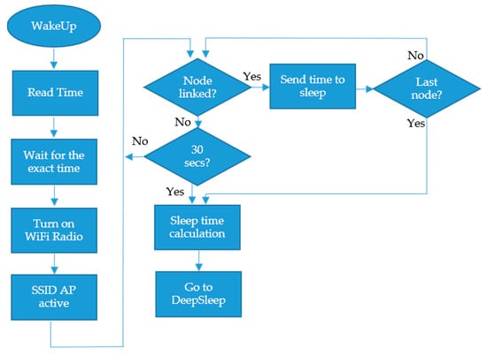 Regarding this issue, a time-synchronization algorithm was developed, so that the sensor nodes and the gateway nodes are synchronized with each other minimizing the connection time between them. The time pattern is always handled by the gateway node since it must “wait” for the sensor nodes to connect and send the information. The flowchart of the algorithm is presented in Figure 9.