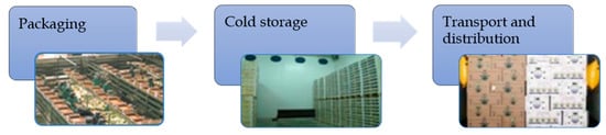 Most of the perishable food to be exported requires several transportation days to reach the destination. To preserve quality of the transported products, recommended environmental conditions are required []. According to FAO (2019) [], 1.3 billion tons are annually wasted, corresponding to more than 30% of all the food produced, from which approximately 50% are fruit and vegetables. These data are unsustainable in our society and require an effort to minimize these extremely high food losses. New technologies such as Internet of Things (IoT) and artificial intelligence (AI) used during the postharvest supply chain would allow us to know more precisely where these losses occur and propose actions to minimize them [,,].
