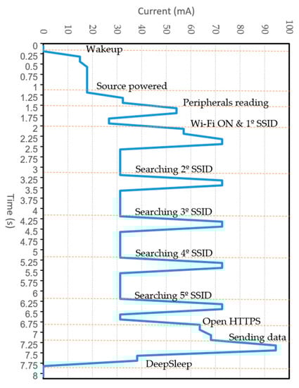 Wi-Fi SSID searching and data sending to the cloud server are the processes with the greatest consumption in the sensor node. In order to calculate the energy consumption in the worst scenario, the sensor node was programmed with five SSID, but only the last one was available. The different modes and routines are described in Figure 12.