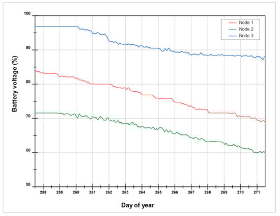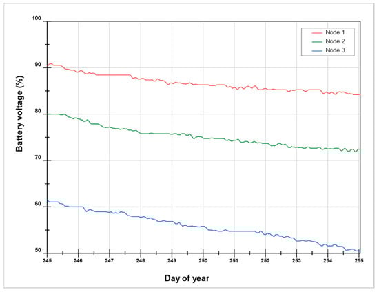During the tests carried out at land transport, different conditions of communication losses with the gateway were observed, as shown in Table 2. The environmental conditions and the location of each node within the transport cabin influence the communication quality and the power consumption. Figure 13 and Figure 14 show the results of the evolution of the voltage during trials 5 and 6, where the different slopes and voltage variations can be seen in accordance with the communication packets lost due to not being able to connect to the first network and trying to connect to the five access points available in the list.
