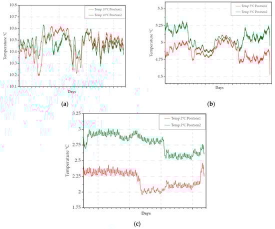 Evolution of the temperature between the two node locations at different temperatures: (a) 10 °C; (b) 5 °C; (c) 2 °C.
