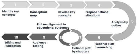 The conceptual map and the key concept definition became the starting point for the professional writer to develop the fiction. Even though the educational guidelines had to be followed, the writer had full control of the narrative fiction and how the story should develop to better trigger the emotional response in the reader. On that regard, there are several methodologies to structure the creation of novels that were carefully considered ([40,41,42]).