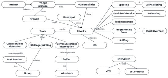 The first questionnaire was answered by the participants at the beginning of the course, containing two blocks of questions: a block to obtain student profile information, with questions related to their enrollment in the university and their previous experience in security; and a second block with a pre-test of ten questions to assess security knowledge prior to working on the learning resources under study (e.g., questions about security tools, attacks, vulnerabilities, countermeasures following the conceptual map previously shown in Figure 2). The answers to these questions were used to compute a pre-study security knowledge score.