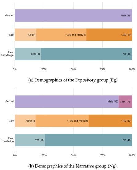Following the recommendations by the ethics committee of the university, students in each group had the option to voluntarily participate in this study. Participation consisted basically of answering two questionnaires. To encourage participation, students that answered the two questionnaires were awarded with 1 extra point out of 10 in the first graded assignment of the course. The Eg group included 63 subjects, out of which 49 participated in the study. The Ng included 71 subjects, out of which 62 participated in the study. Figure 3 shows the main demographic variables of the participants in the study for both groups.