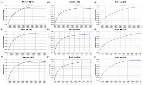 View of displacement curves for (A–C) c1; (D–F) c2; (G–I) c3 with permanent deformations to the right sides of the graphs.