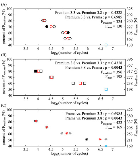 Cyclical performance to fracture. Significant differences occur between the groups in bold. Red marks arethe mean values; cyan marks arethe maximum values of the force to achieve five million cycles. (A) c1 circle; (B) c2 square; (C) c3 asterisk. Black empty mark: simple sudden fracture of the specimen. Black full mark: both deformation and fracture of the specimen.