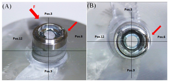 In the static load test, the maximum breakout forces were calculated, known as Ultimate Failure Loads (UFLs), which are functions of the specimens’ bending moments (BMs). Each implant, as soon as the test was over, was checked and photographed. Any metal fracture or displacement (higher than 0.4 cm) was considered to be a fatigue failure.