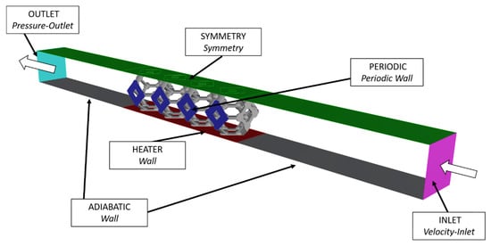 To ensure the fully-developed flow before the air entrance into the foams, an upstream duct of 40 mm was modeled (not at scale in Figure 3, for the sake of visualization). Similarly, a downstream duct with the same length was also added, as shown in Figure 3. Velocities ranging from 0.5 to 4 m s−1 and temperature of 298 K were set to the inlet face, resulting in a laminar airflow with Reynolds number based on the strut diameter lower than 300 [27]. The pressure-outlet condition was applied at the exit, setting it at the ambient pressure (gauge pressure of 0 Pa). The up- and downstream ducts were considered adiabatic, therefore no heat or mass exchanges were possible. To heat the system, an aluminum heater of 2 × 8 mm2 and thickness of 0.1 mm was modeled; its face was defined as a wall at a constant temperature of 373 K. At both sides of the system, a periodical condition was set. Differently from [27], the present authors modeled half of the entire system. However, since the aim was to replicate the geometry and the operating conditions from [27], the uppermost face was considered as a symmetry plane, and a symmetry boundary condition was adopted consequently. The two systems are perfectly comparable. In Table 2, the material properties as taken from Ansys Fluent 18.2 database are reported.