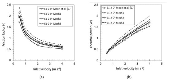 Mesh sensitivity analysis: (a) Friction factor and (b) thermal power.