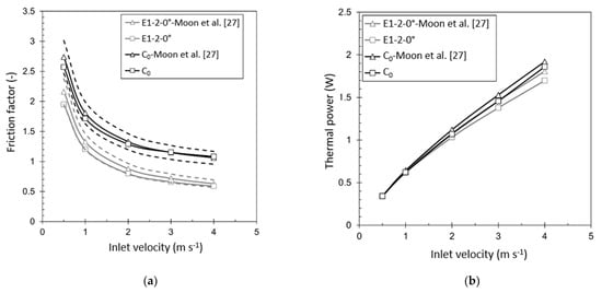Figure 5 clearly demonstrates the validity of the developed numerical model. As shown in Figure 5a, the friction factor deviates less than 10% (represented by the dotted lines) from Moon et al.’s [27] results, both for the elliptical and cylindrical configurations. Moreover, the results for the cylindrical case differ less than 3.5% with respect to the results for the same case [27]. Even for the thermal power Q, similar conclusion can be taken. Our simulated cases deviate no more than 4% from what reported in [27] for all the investigated scenarios. The minor differences between the results may be attributed to a different numerical model generation: in fact, as explained above, differently from Moon et al. [27], the present authors studied half of the geometrical domain, taking advantage of the symmetry of the system. Therefore, despite the small deviations, the present numerical model can be considered a valid alternative requiring almost half of the computational effort which can have a positive effect on computational efficiency allowing for the possibility of investigating many additional cases.