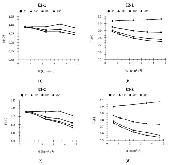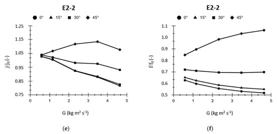 To analyze the effect of the elliptical fiber orientation on the heat transfer and pressure drops with respect to the reference circular strut (subscript “0”), the ratios of Colbourn numbers and friction factors as function of the air mass velocity (G) were used, respectively. The friction factor f was calculated by Equation (4), while the Colbourn number j was obtained by means of the following equation: