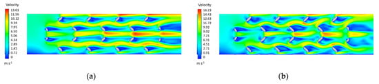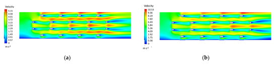 This phenomenon can be explained by investigating the contours of air velocity inside the foams before the 3 m s−1 (i.e., 2 m s−1 inlet velocity) (Figure 8a,c,e,g) and this value (i.e., 4 m s−1 inlet velocity) (Figure 8b,d,f,h). At 2 m s−1, the highest value of the velocity through the fibers grows as the orientation increases. In fact, it can be noticed that from 0° (Figure 8a) to 45° (Figure 8g), the maximum velocity increases from 5.15 m s−1 to 6.17 m s−1. Therefore, the increasing tortuosity could justify the enhancement of the heat transfer due to the continuous mixing of the fluid. Nevertheless, considering 4 m s−1 inlet velocity something different can be inferred. All the foams show longer stagnation zones behind the fibers, i.e., dead zone. The stagnation zones can be detrimental for the heat transfer, because extremely low velocities cause the convective heat transfer coefficient to decrease. Moreover, for 4 m s−1, the local maximum velocity is not completely developed as it was for 2 m s−1. The worst case is reached with 45° fibers’ inclination (Figure 8h) because the velocity achieves its maximum value only in the central zones of the periodic foam.