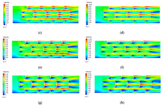 Velocity contours for E1-2 at 2 m s−1 (a,c,e,g) and 4 m s−1 (b,d,f,h).
