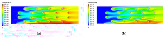 In Figure 9, the negative effect of the stagnation zones can be appreciated. In fact, as shown in Figure 9a, the air temperature behind the fibers is higher if compared with air temperature shown in Figure 9b. Despite that, the latter presents a j/j0 ratio which is over the unity (1.064). This means that E1-2, 45° performs better than the reference circular struts even at the highest investigated velocity.