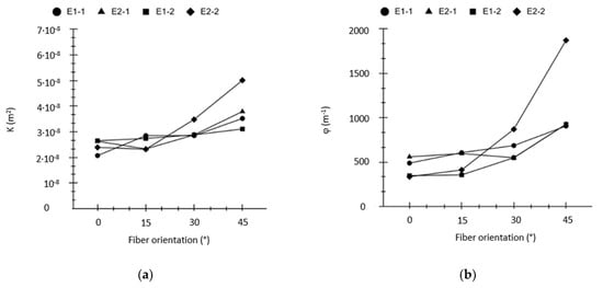 K (a) and φ (b) trends as function of the fiber orientation.