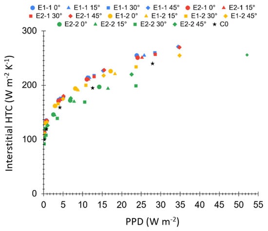 Nevertheless, aiming at establishing the best thermal performance among the different investigated configurations, it is interesting to analyze the interstitial HTC (Equation (7)) as a function of the pumping power per area density (PPD) (W m−2). This parameter is defined as the ratio between the product of pressure drops ΔP (Pa) and volumetric flow rate (m3 s−1), and heat transfer area A (m2) as given by: