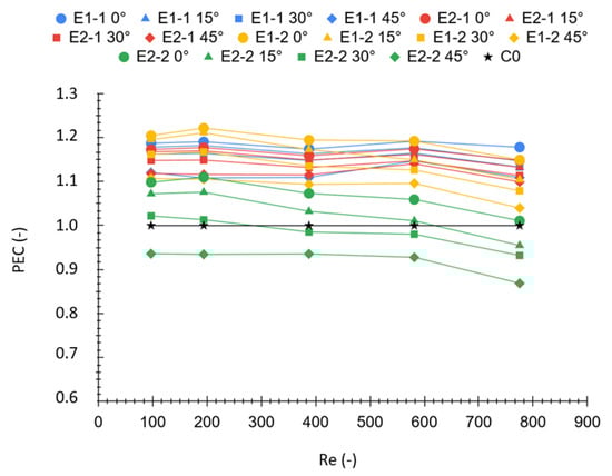 Therefore, among the possible Performance Evaluation Criteria (PEC) [28], the following one, as reported in Equation (14), was used as a function of Reynolds number (Equation (15)), to compare the different configurations:
